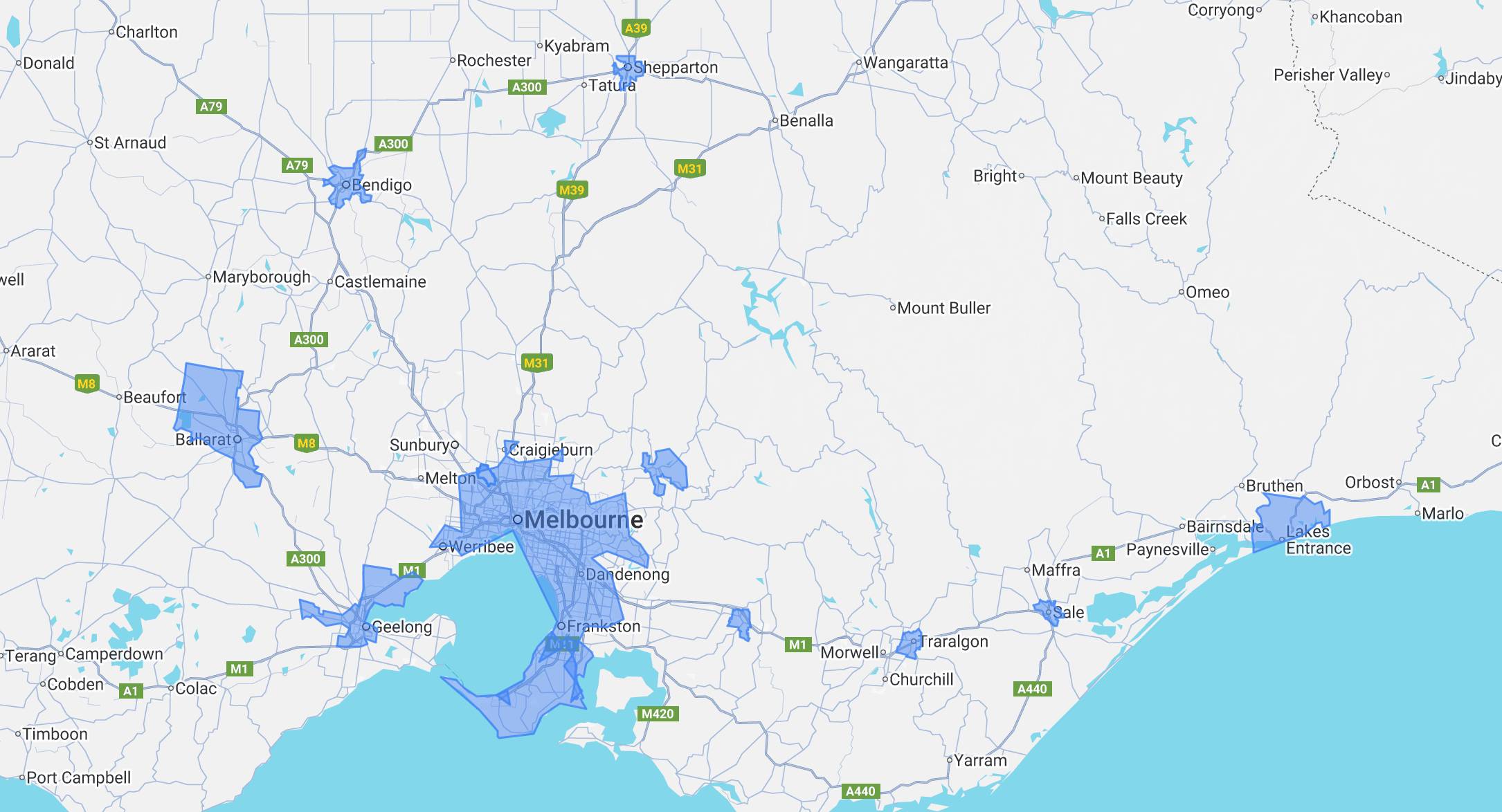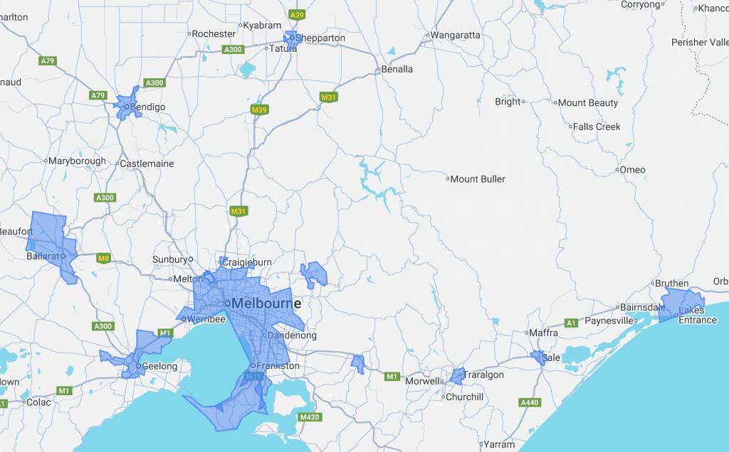 From the Melbourne CBD and surrounds, to outer south east suburbs of Frankston, Philip island, Pakenham, Garfield, Warragul, Drouin, Traralgon, Sale, Lakes Entrance, Healesville and the Yarra valley. See the map below for the locations.
